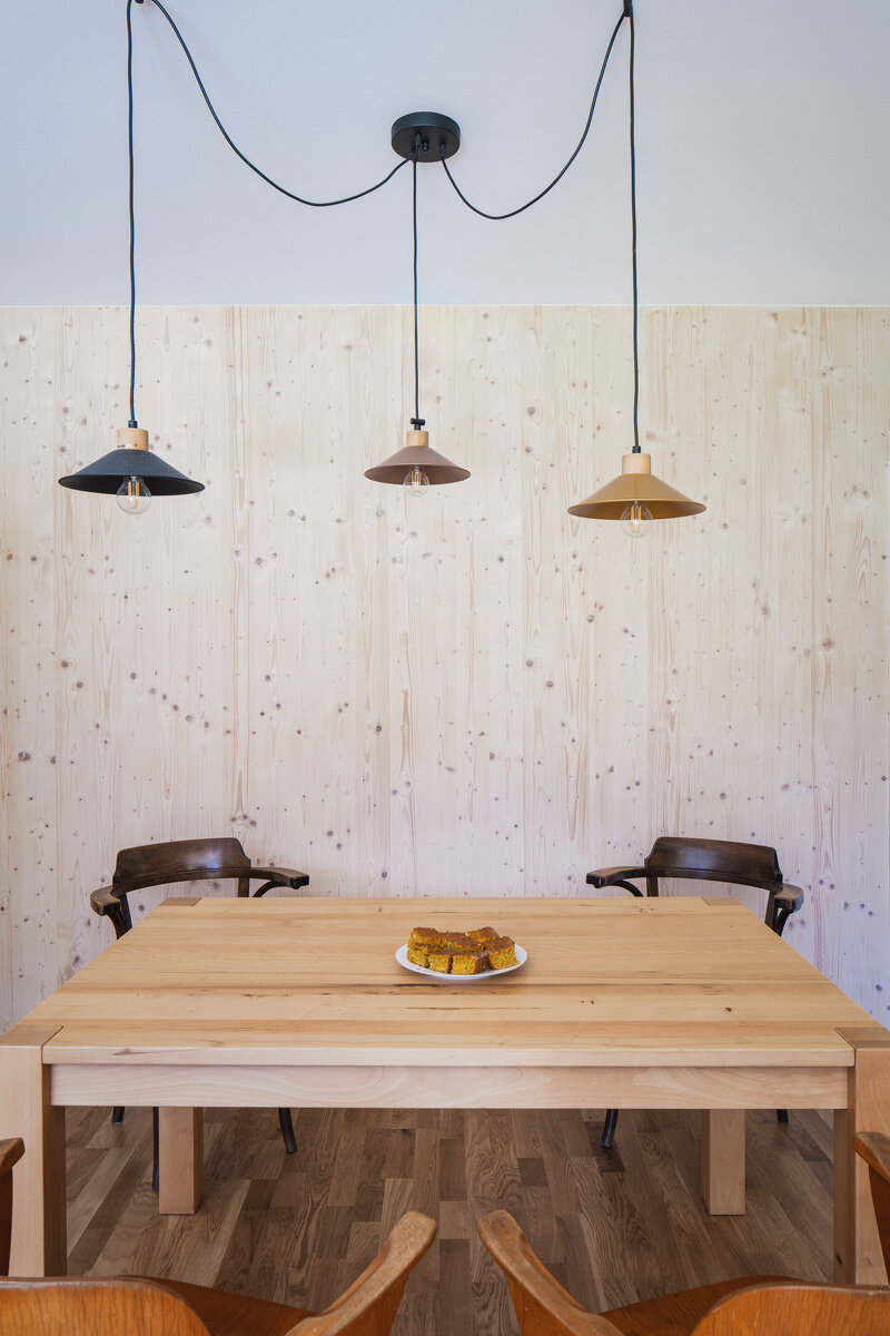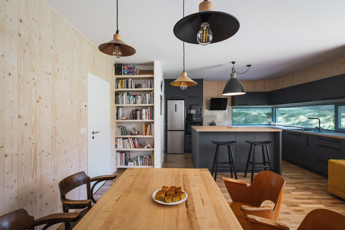 Nosná konstrukce je provedena z masivních dřevěných CLT panelů. Panely jsou v interiéru přiznané bez dalšího opláštění. Díky tomu prostor krásně dýchá dřevem a stěny působí hřejivým dojmem. Původním plánem bylo nechat obývací pokoj s jídelnou a kuchyní otevřený do krovu. Z důvodu úspory nákladů bylo od této myšlenky upuštěno. Díky tomu ale získali majitelé větší prostor půdy.
