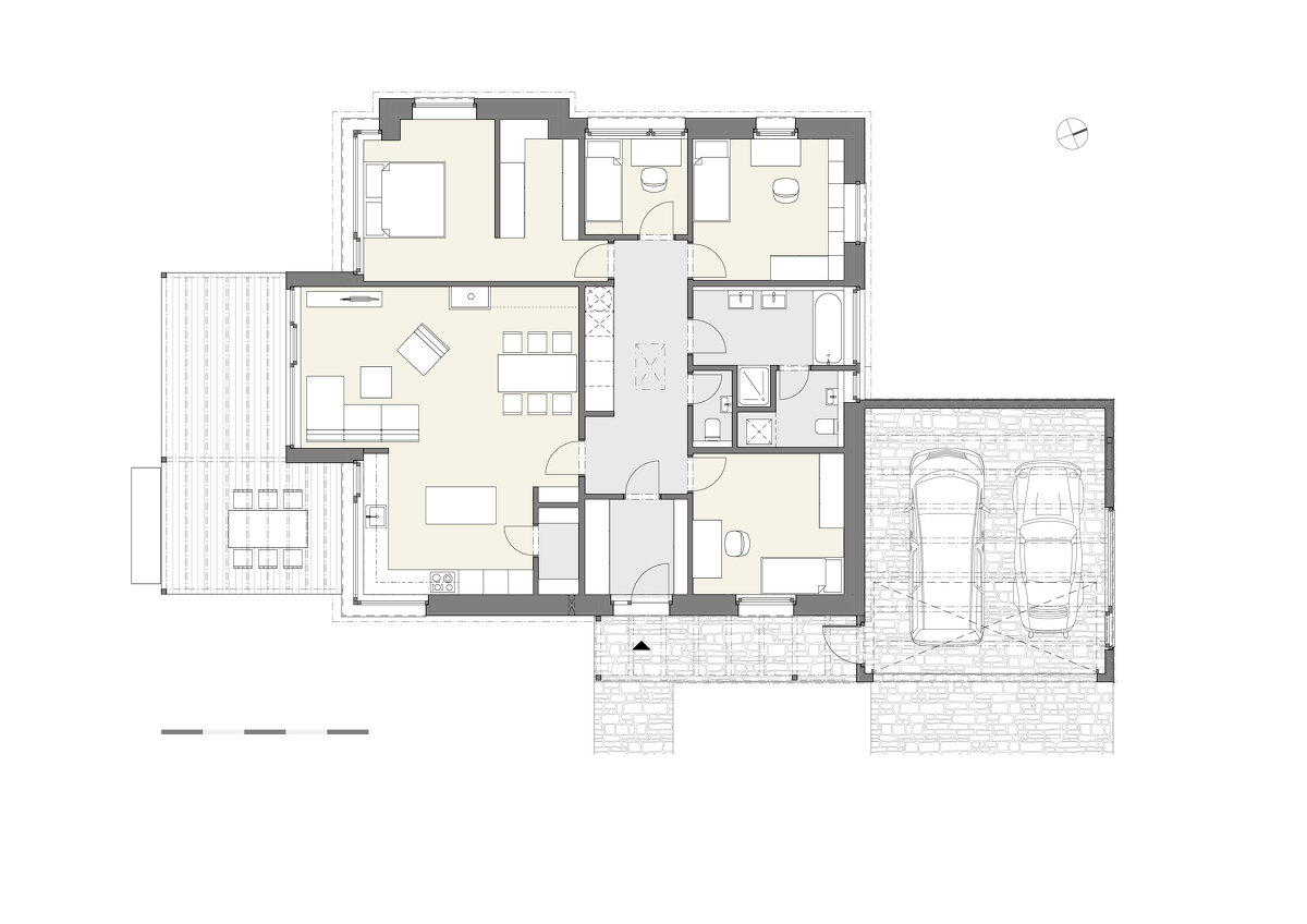 Dispozičně je dům řešený jako trojtrakt. Ve středu dispozice se nachází vstupní a komunikační část. Srdcem domu je kuchyň propojená s obývacím pokojem a jídelnou. Odtud je vstup na prostornou terasu a na zahradu. Kromě dvou dětských pokojů a ložnice rodičů se šatnou se podařilo najít místo i na pracovnu, která může být využita také jako hostinský pokoj. Díky prostoru pro niku v půdorysu základů se v ložnici rodičů podařilo vytvořit prostorné sedací okno.