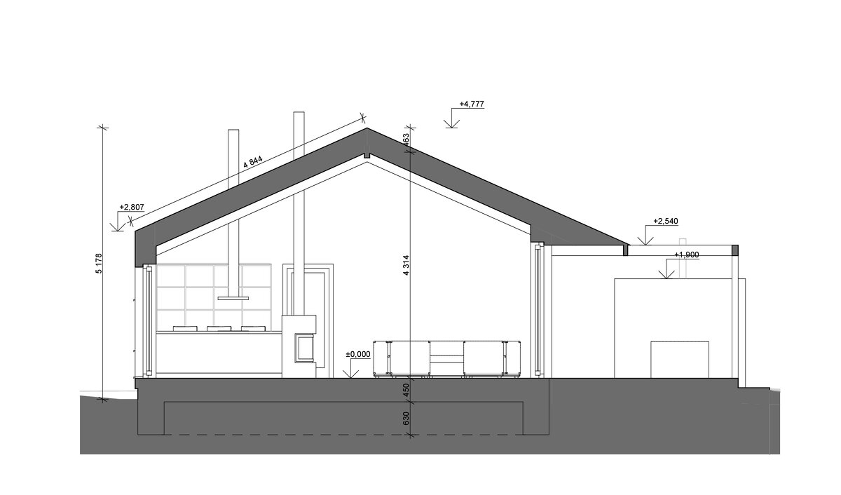 Fasáda odpovídá materiálovému řešení nosné konstrukce. Proto je navržená z dřevěných prken.