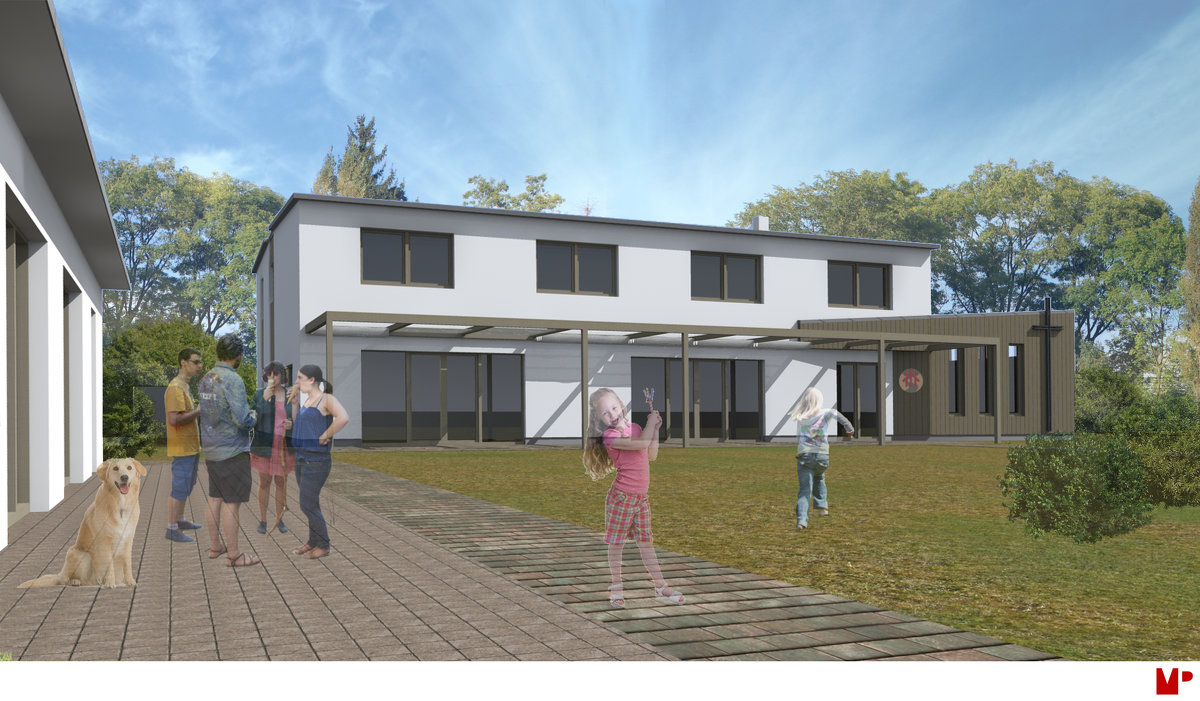 Umístění novostavby je navrženo tak, aby byla budova v blízkosti stávajícího hlavního vstupu na pozemek. Zároveň tvoří budova jednotný urbanistický celek s objektem stávajících garáží. Na pozemku je dále umístěno dětské hřiště a travnatá plocha pro míčové hry. Pozice stávajících vstupů/vjezdů zůstává beze změn.